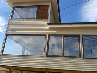 Muzio ConstruccionesInstalación de termopaneles en paños fijos estructurados en marcos de madera con terminación esquina cristal desplazado.