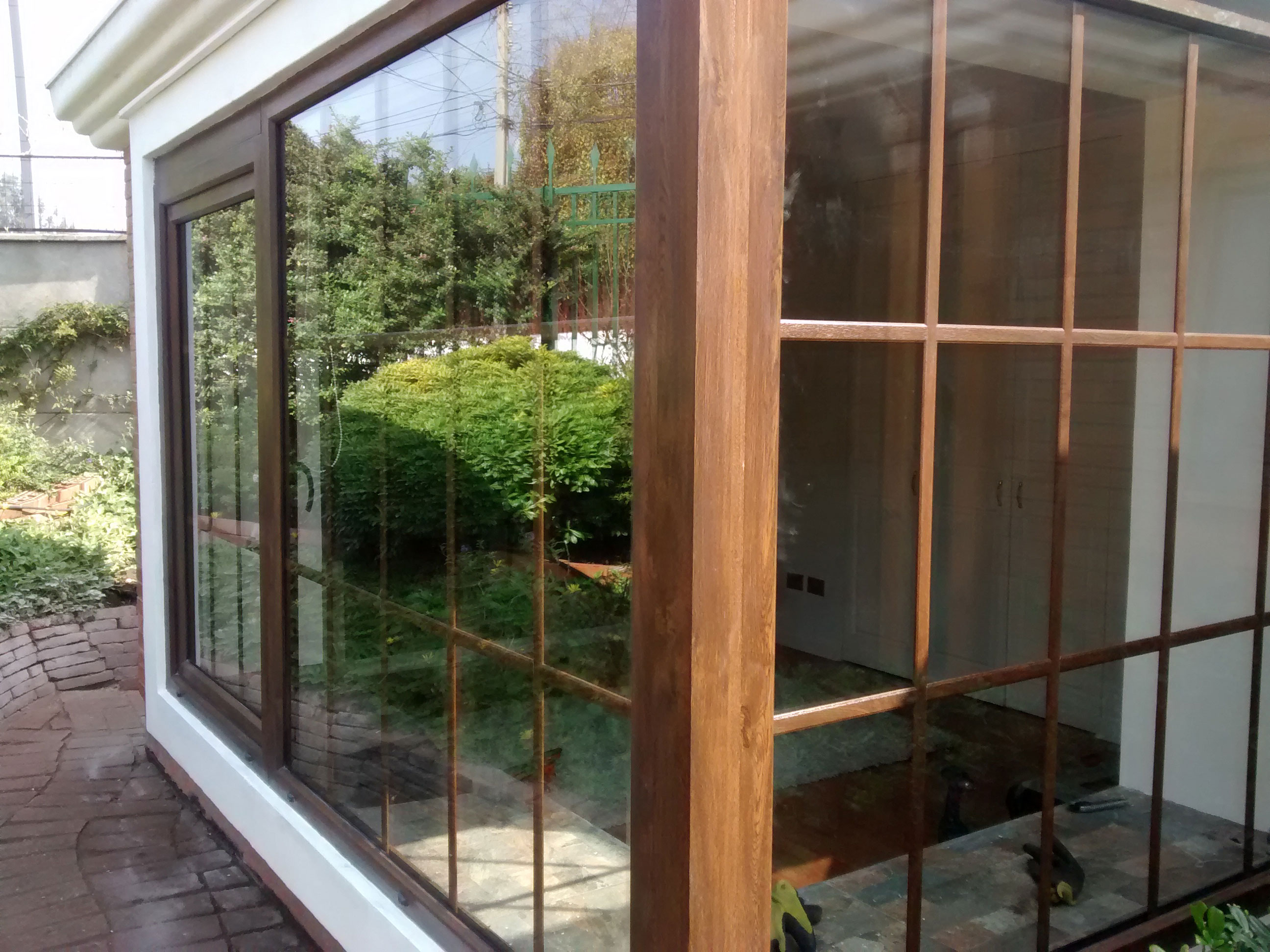 Propietario Jorge LópezVentanas de pvc folio madera color nogal donde sólo se consideró dos paños fijos laterales y dos correderas centrales con termopaneles (perfil de pvc monorriel).