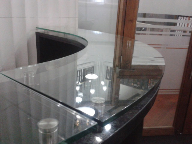 Sociedad Onetto y Cía. Ltda.Cubierta en forma, de cristal incoloro de 12mm para mueble de recepción edificio corporativo.