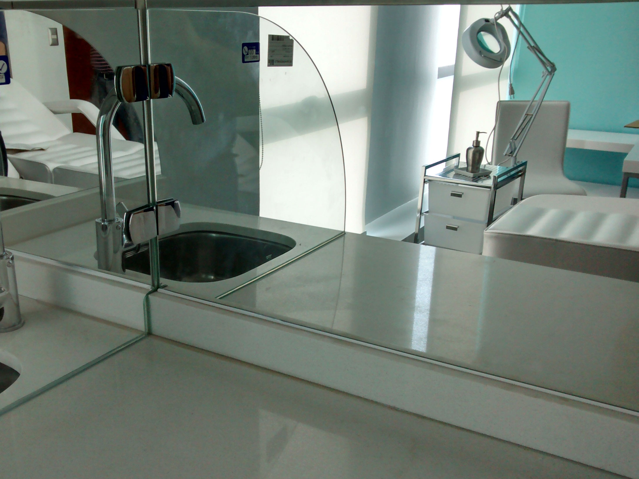 Dra. Carla OlavarríaInstalación de espejos incoloros con cantos pulidos en muralla y cristal templado divisorio.