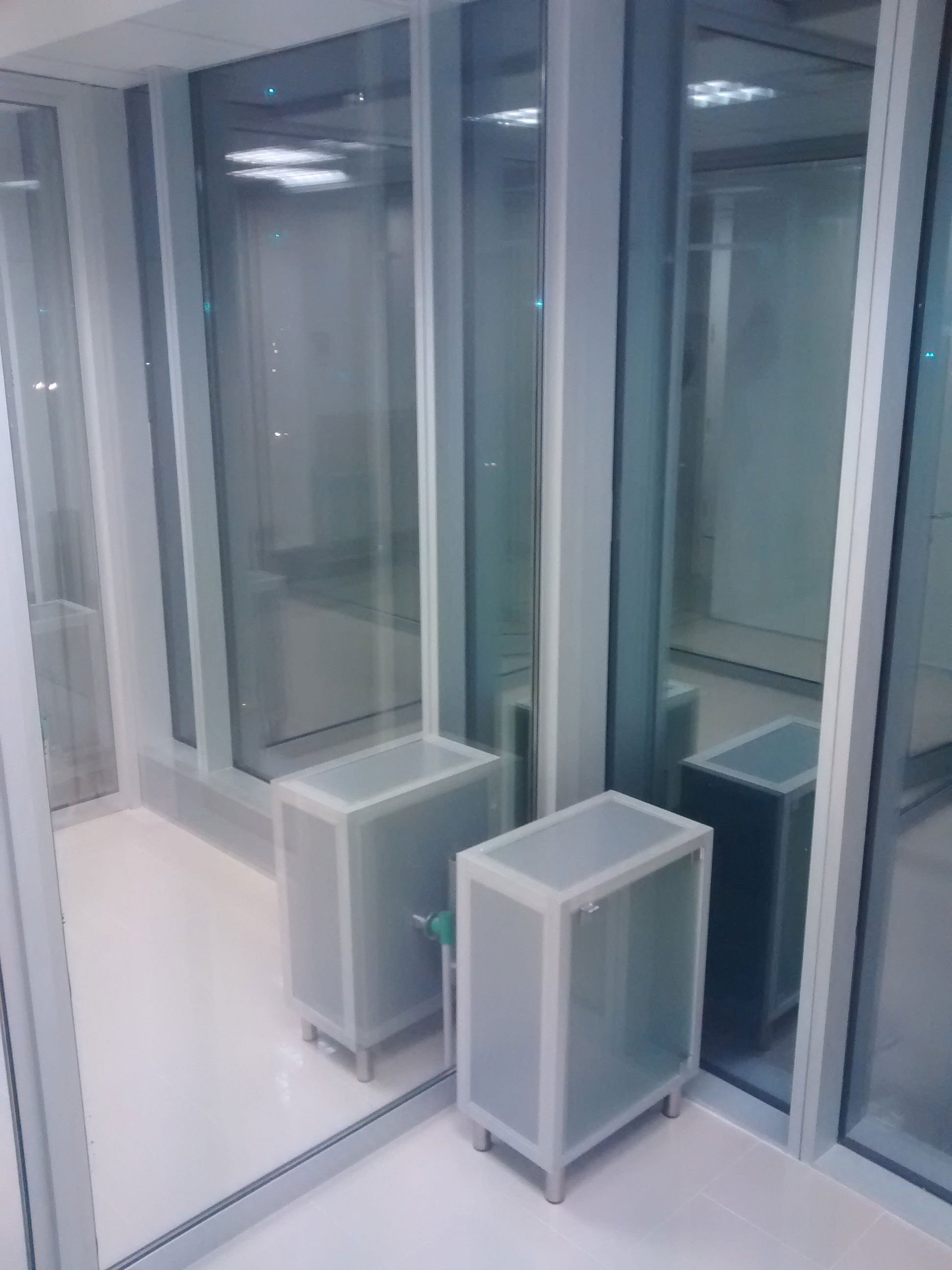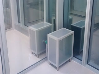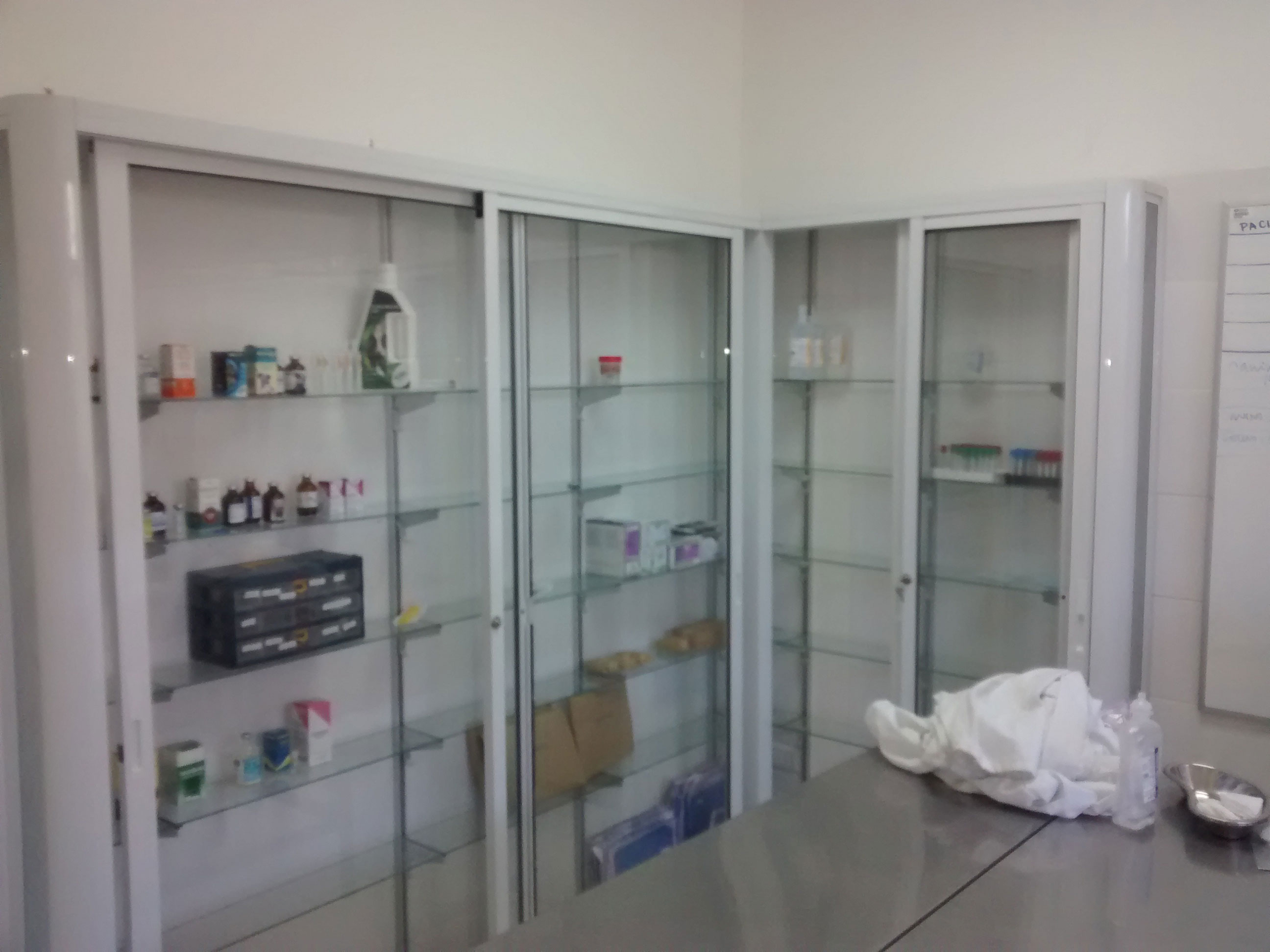Clínica Veterinaria Universidad de las AméricasMueble estructurado en perfiles de aluminio blanco con cristales incoloros donde se consideraron repisas interiores.