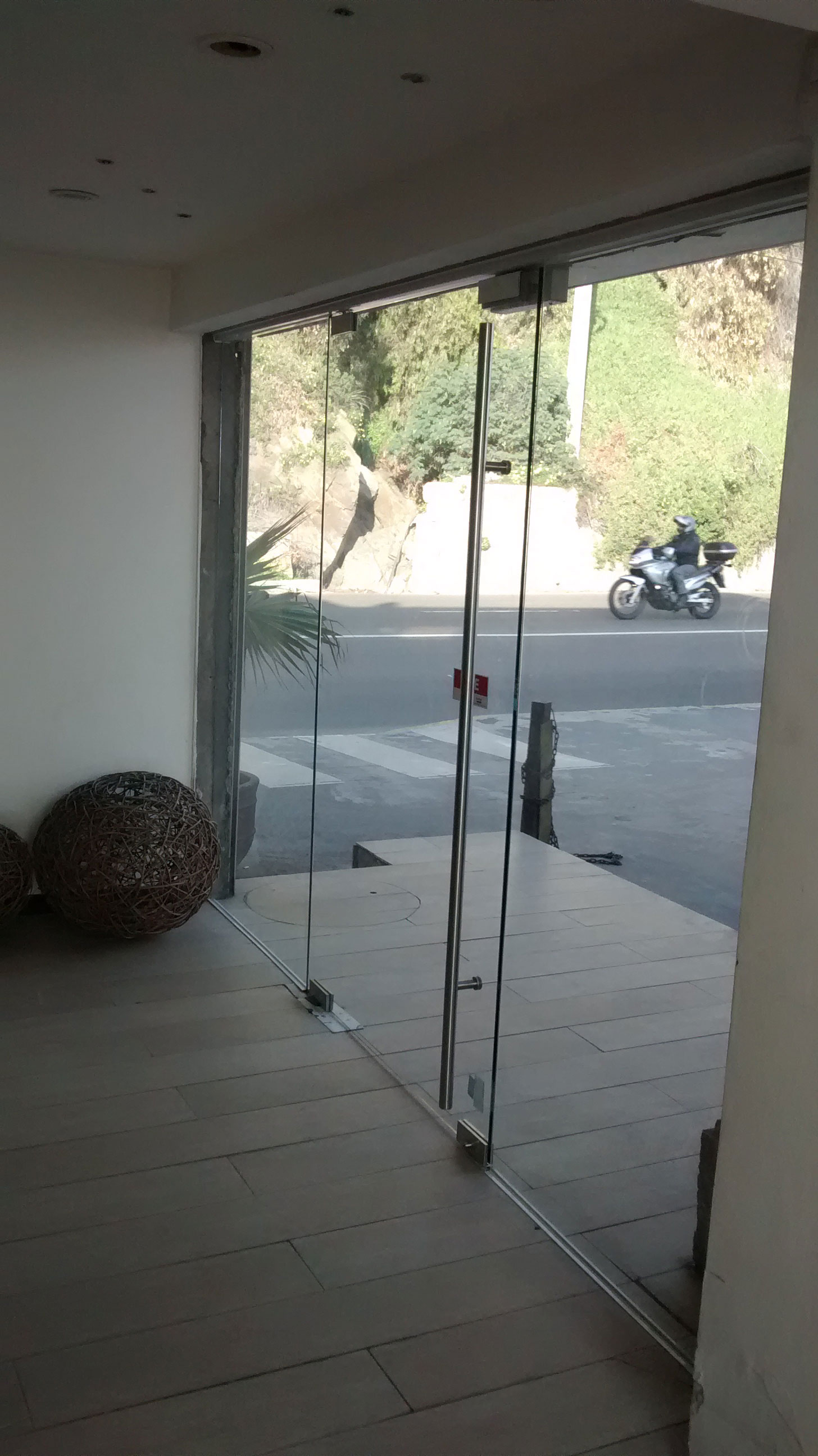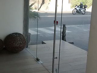 Compañía sudamericana de VaporesPuerta de acceso automática con quicio hidráulico donde se consideró dos hojas de vaivén y dos paños fijos laterales con zócalo y cabezal perfil curvo de Indalum, en cristal templado de 10mm.